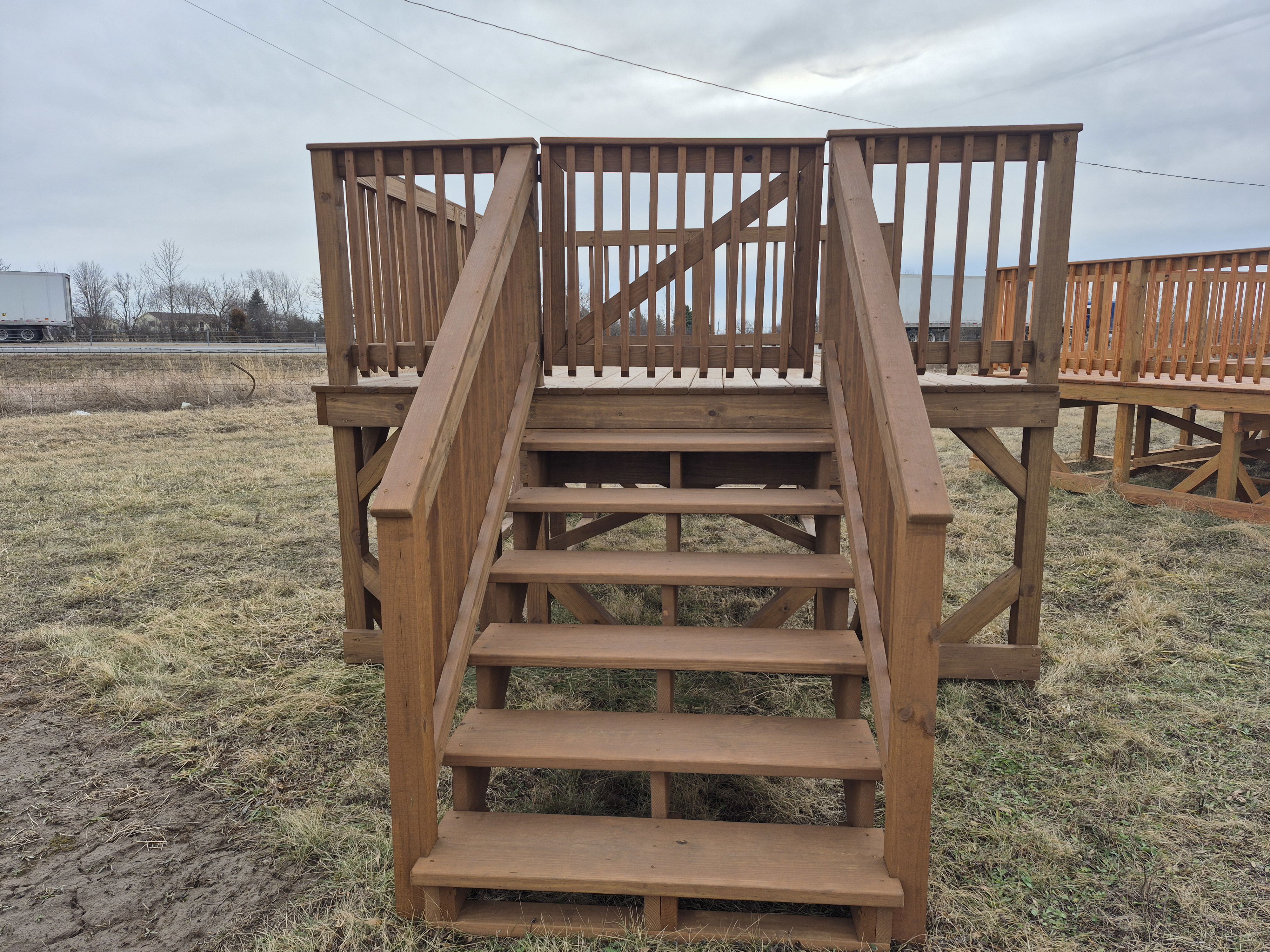 Deck is cut to contour to an 18' round pool. Gate added at top of stairs. Elevation height at 52" 50 Miles FREE Delivery and Set-up. Rent to Own options available.