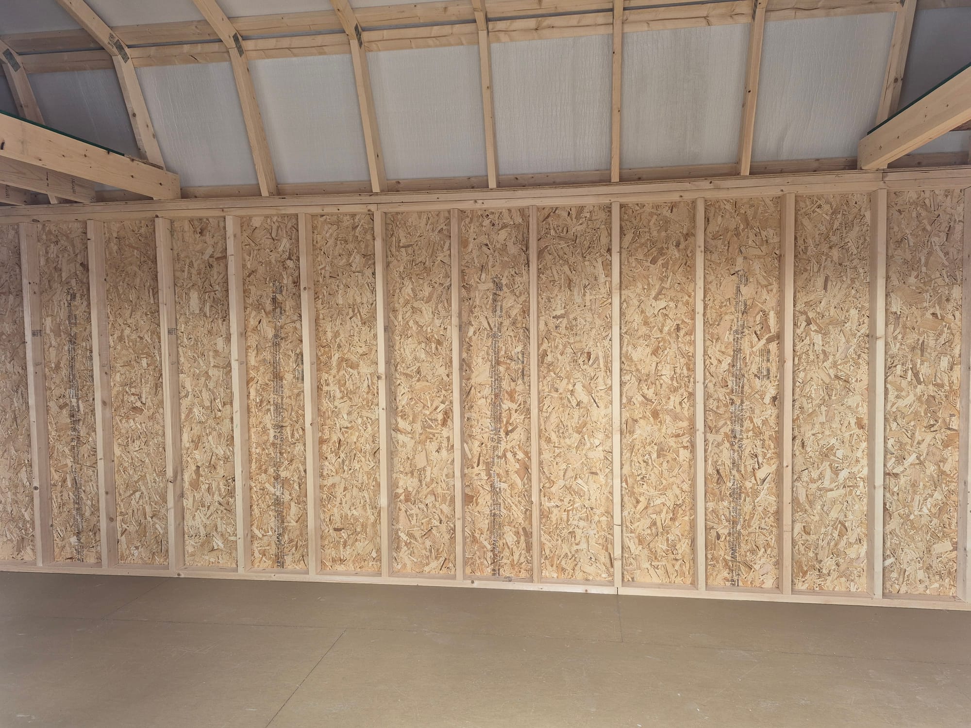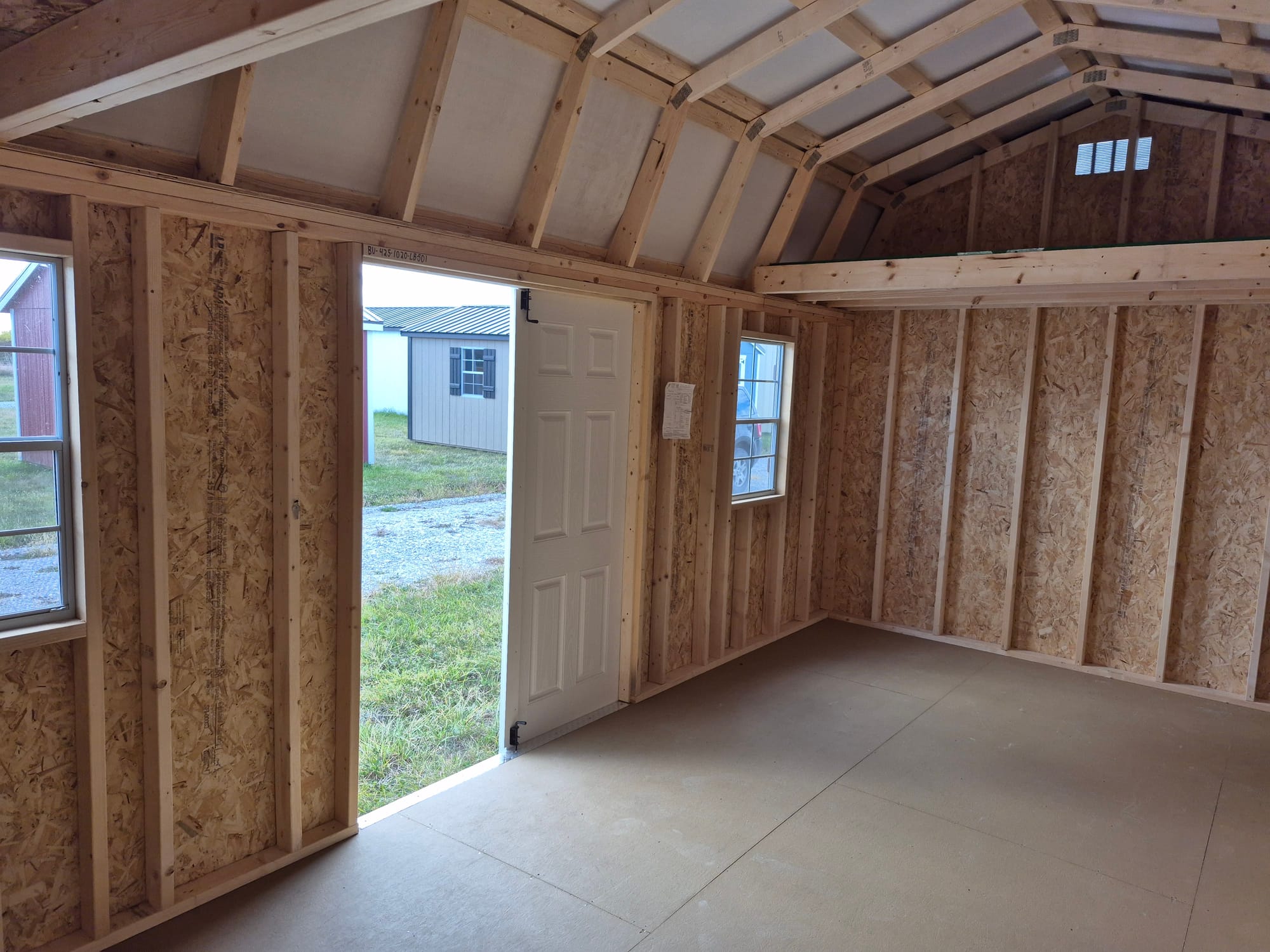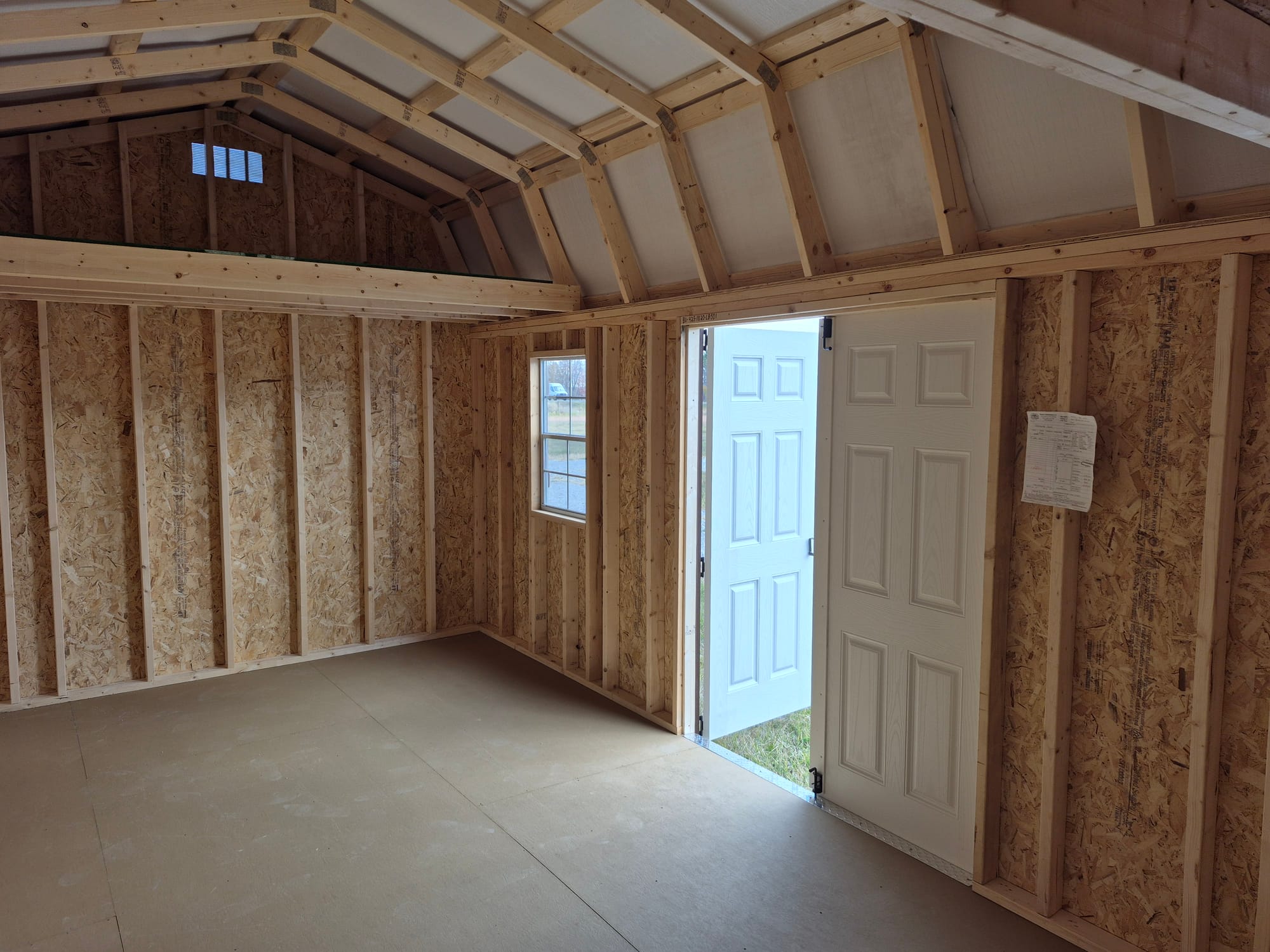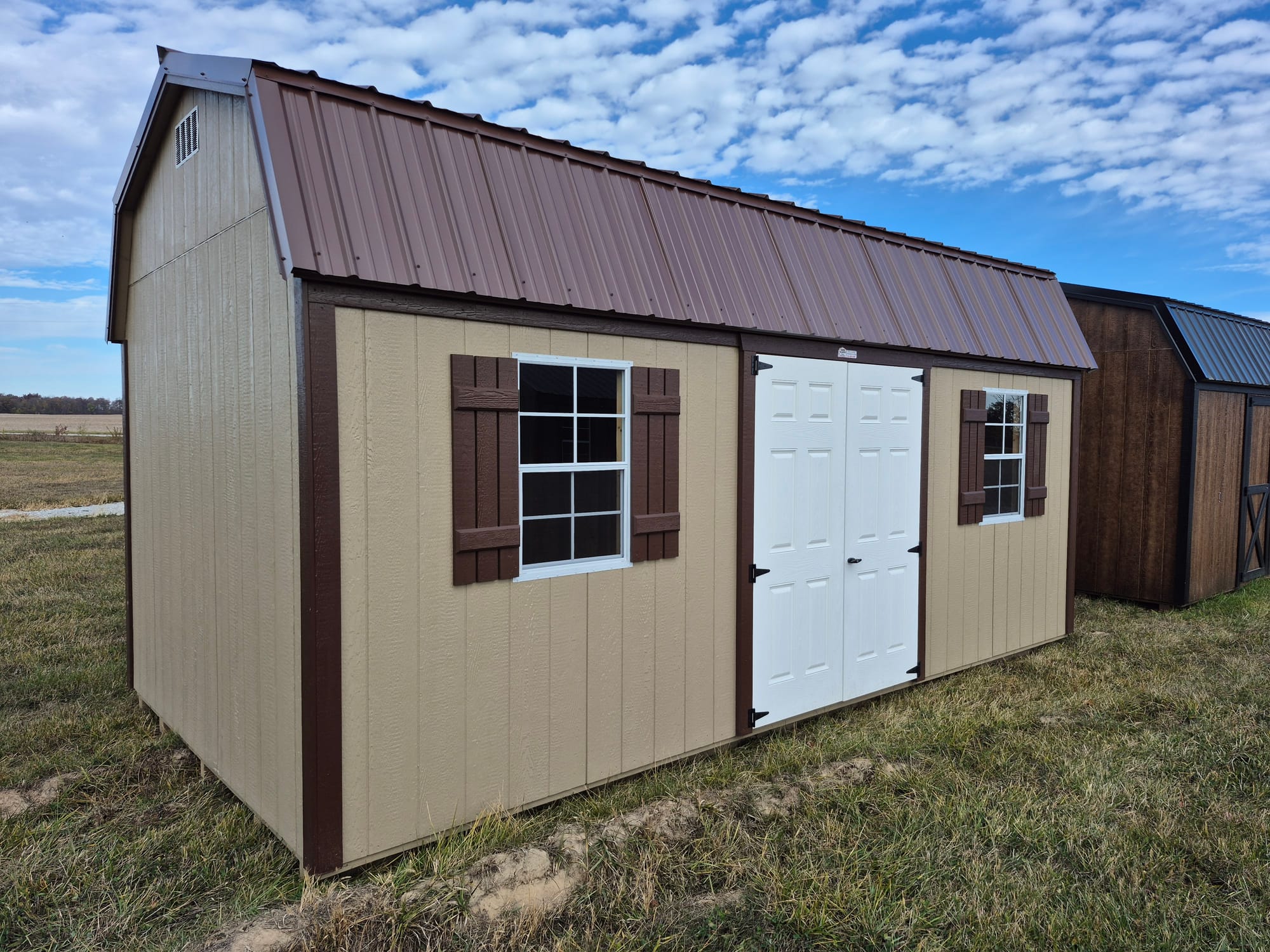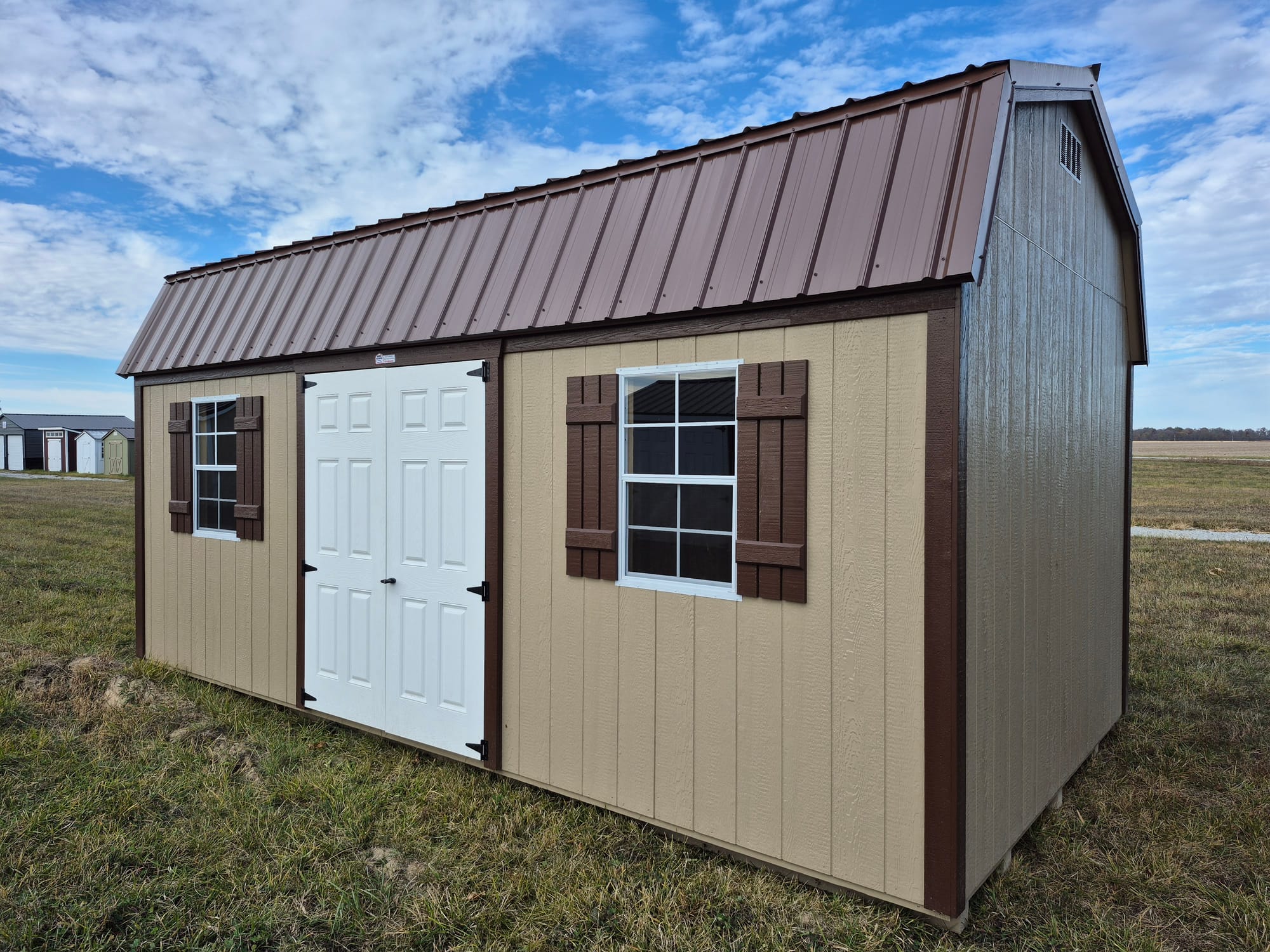 Double Fiberglass Door and 2 windows on broad side of building. 4' deep loft on either end. Colors are Buckskin siding, Dark brown trim and Brown roof. 50 miles FREE delivery/set-up. Rent to Own options are available.