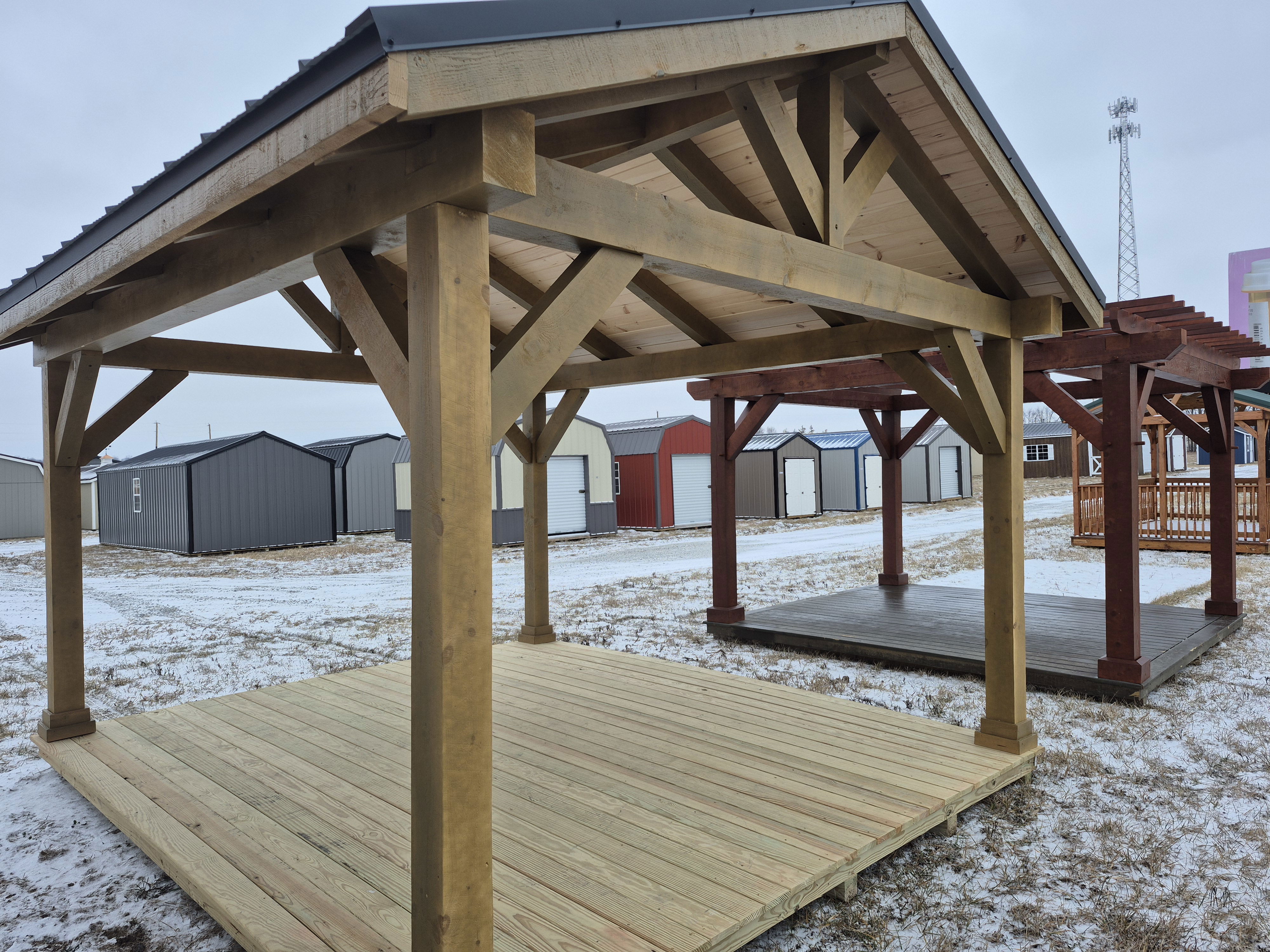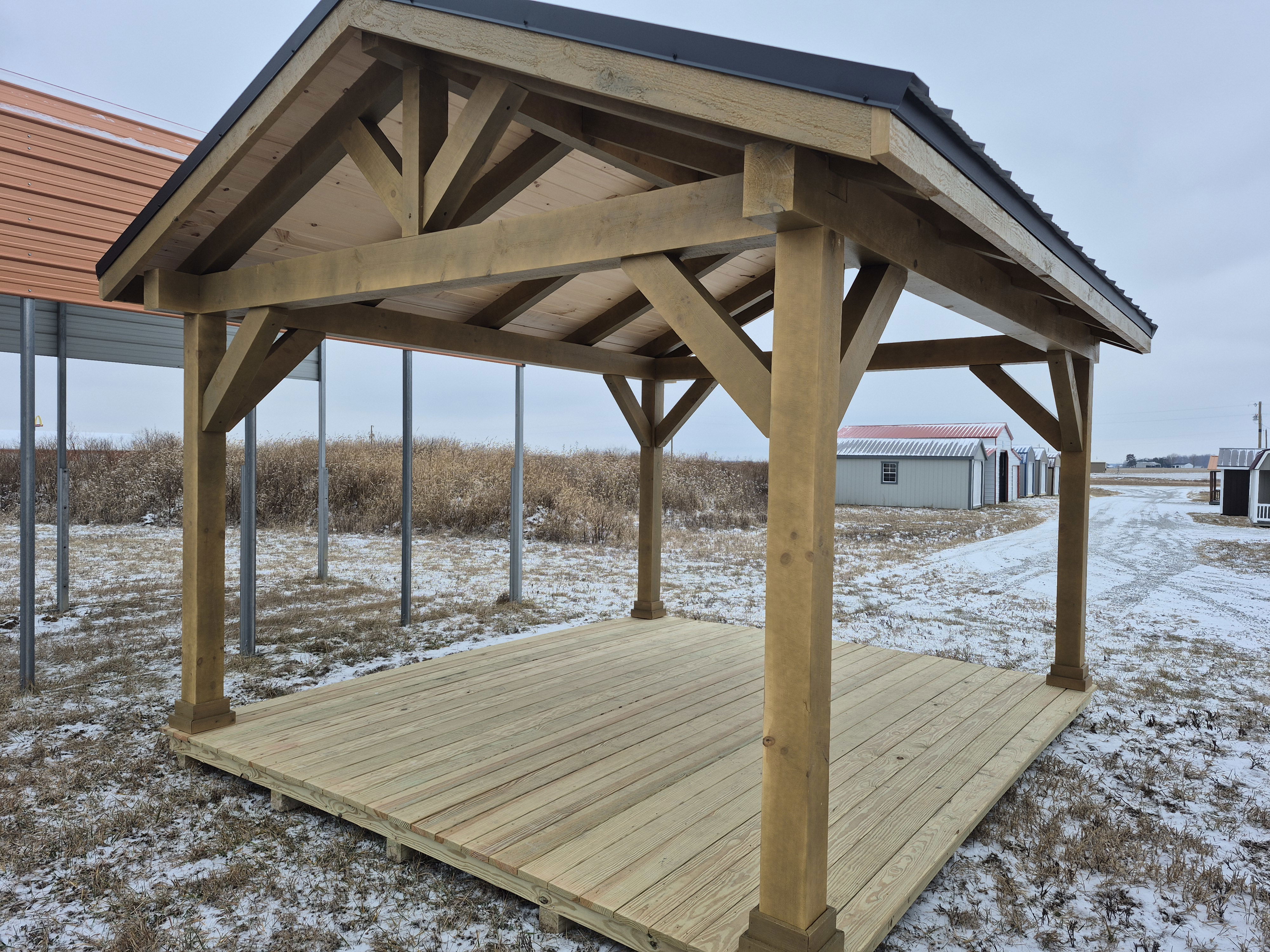 Eastern White Pine timbers used. Pick your roof pitch between 5/12 and 9/12 at no additional cost. Available in White Pine or Douglas Fir. Price is for pavilion to be installed directly on your concrete or wood surface. Many different sizes/styles available. FREE delivery included with install.