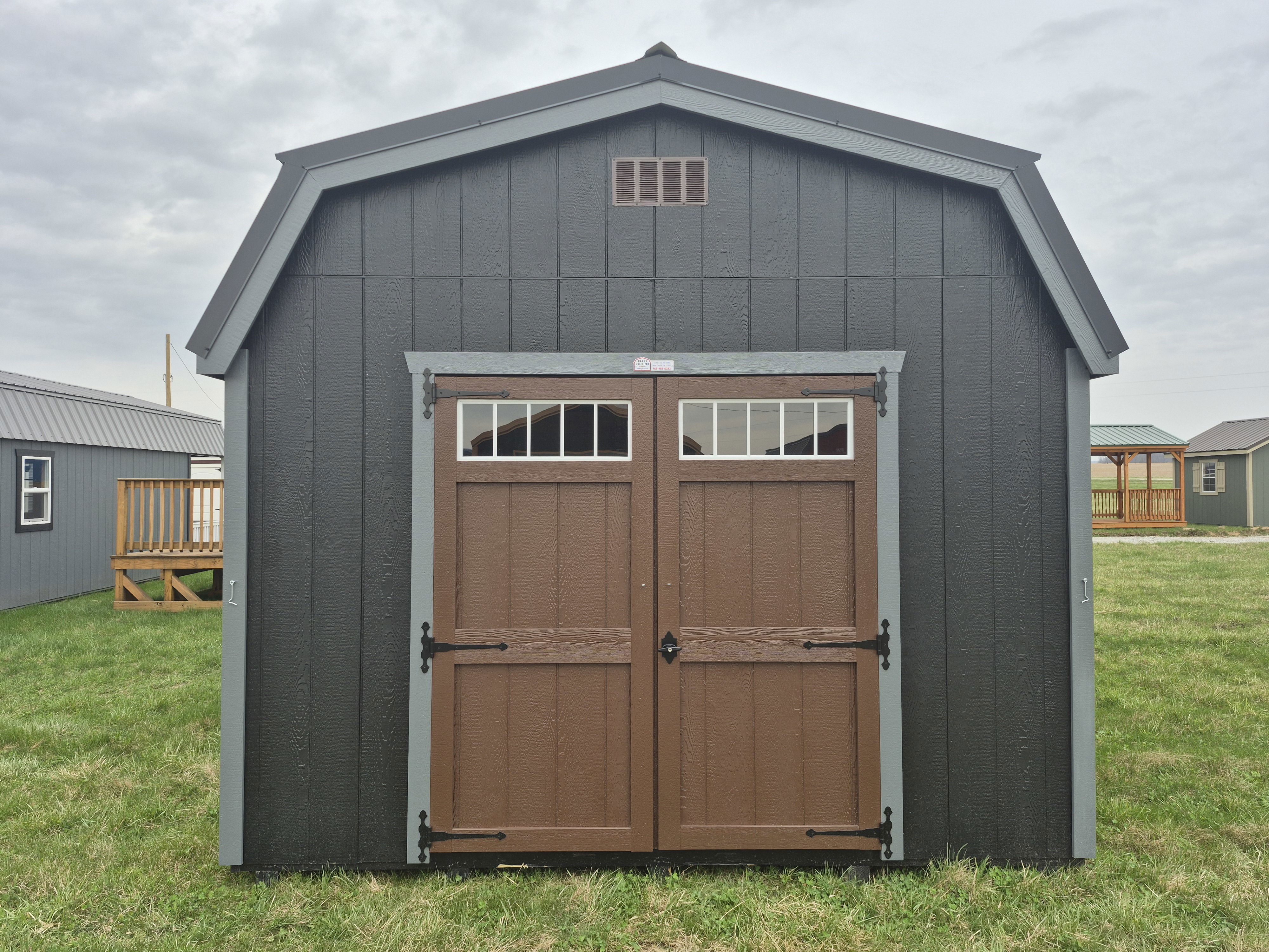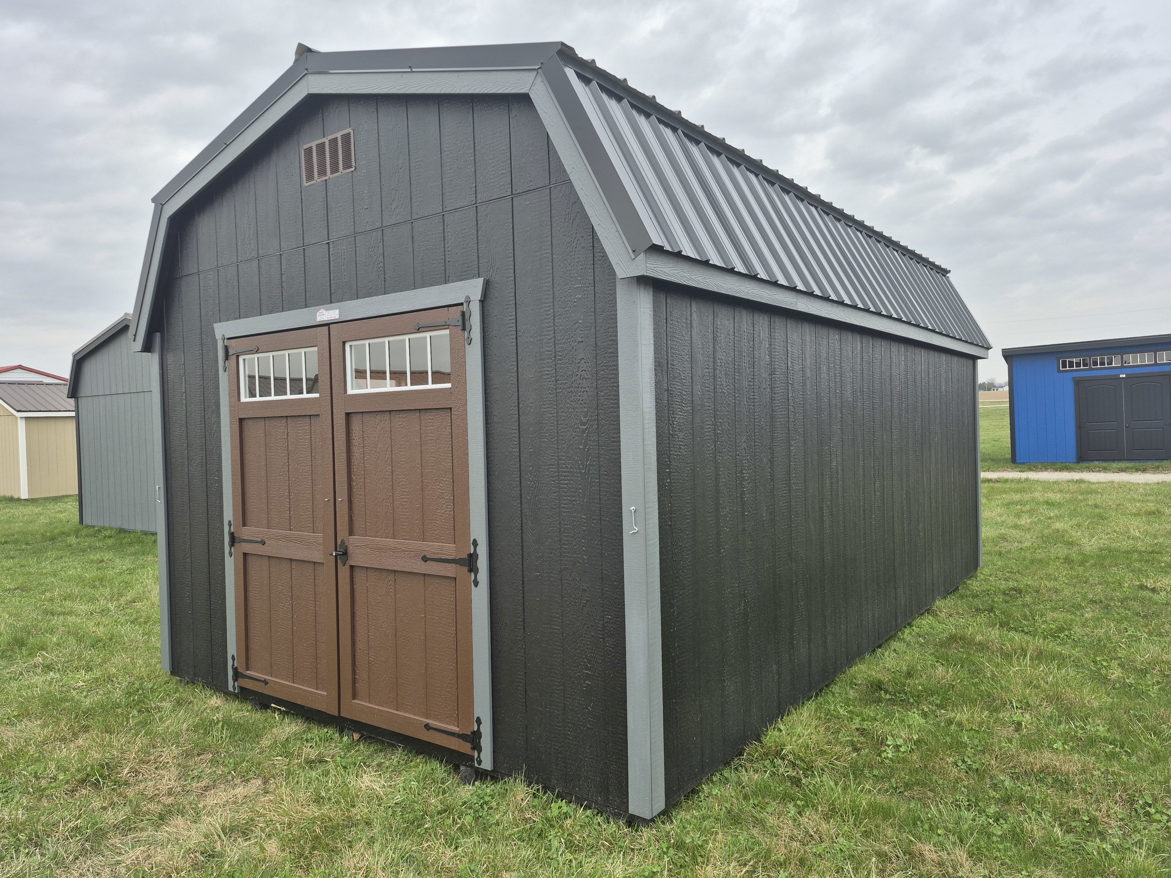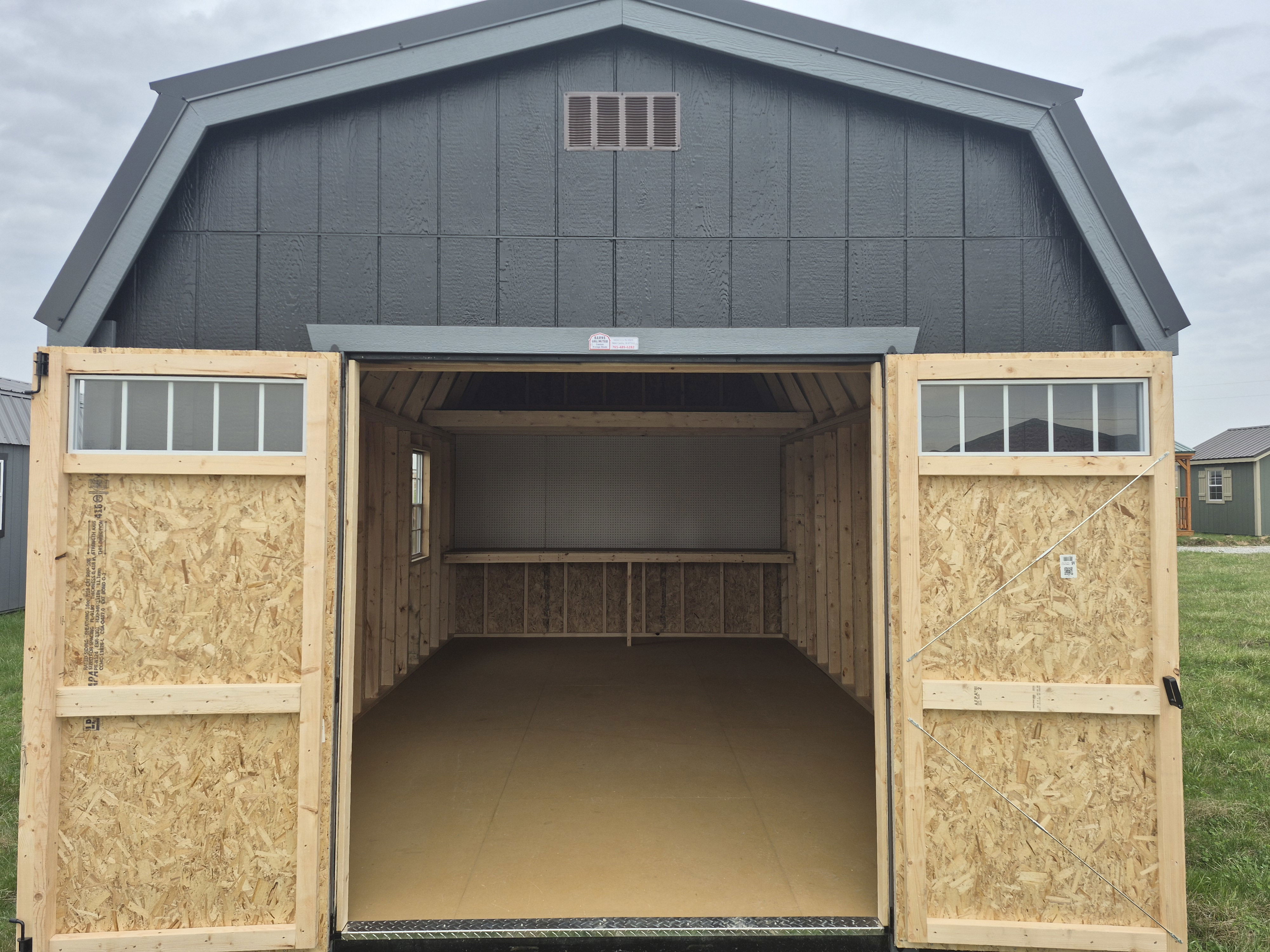 Double-door on front end. 2 windows on left-hand side. Loft on each end. Workbench with pegboard underneath back loft. Comes with all the Classic upgrades. Black siding, with Dark grey trim, Stained doors/shutters, and black metal roof.
