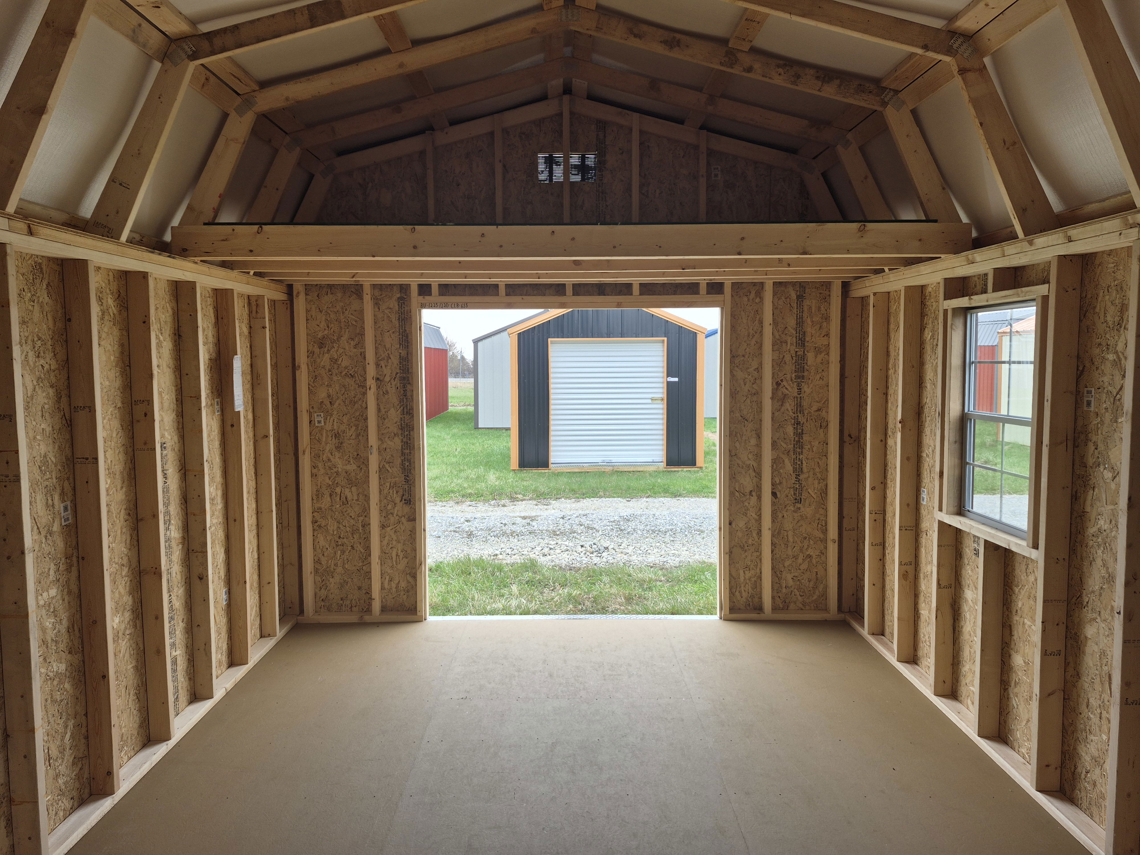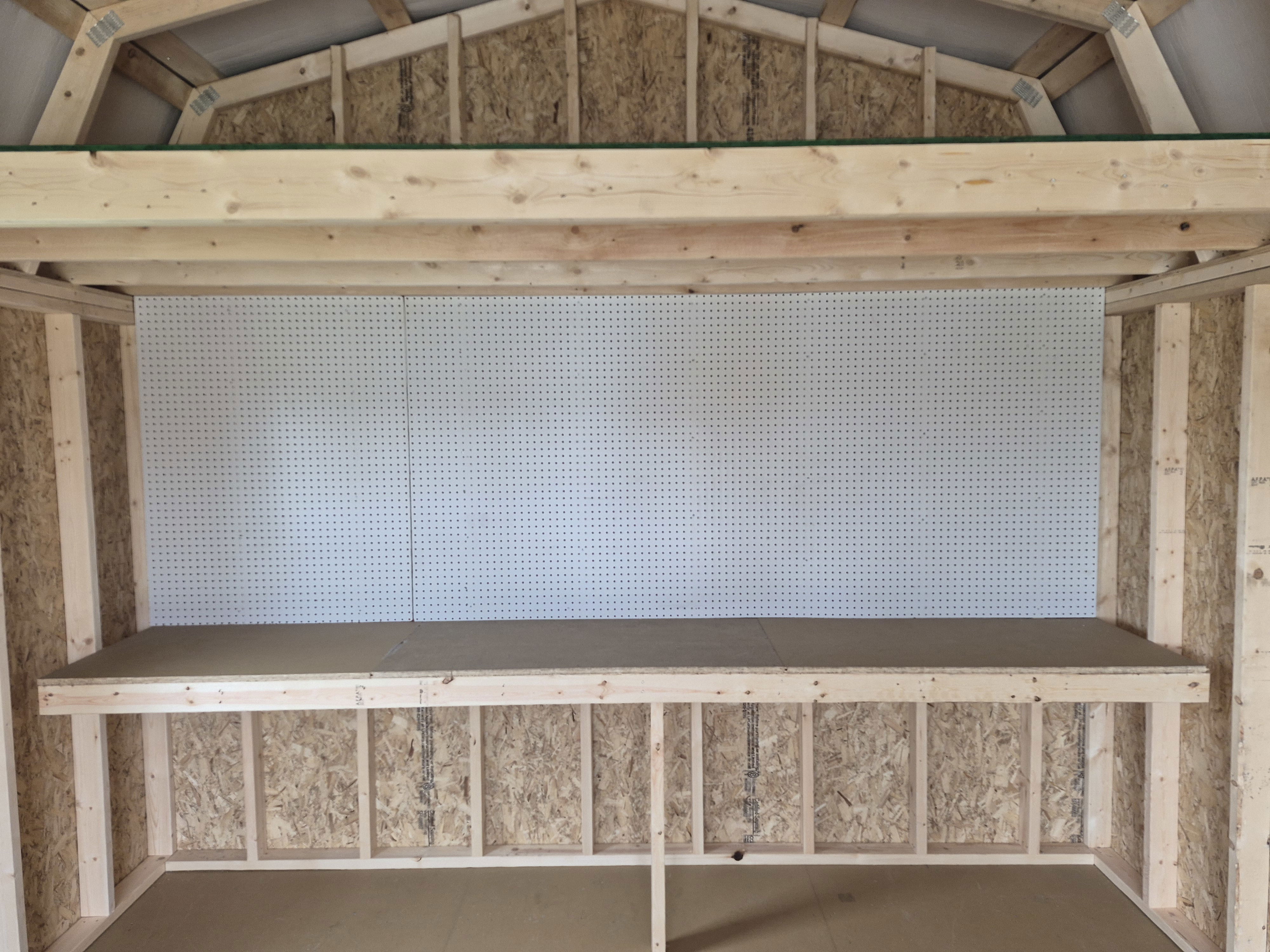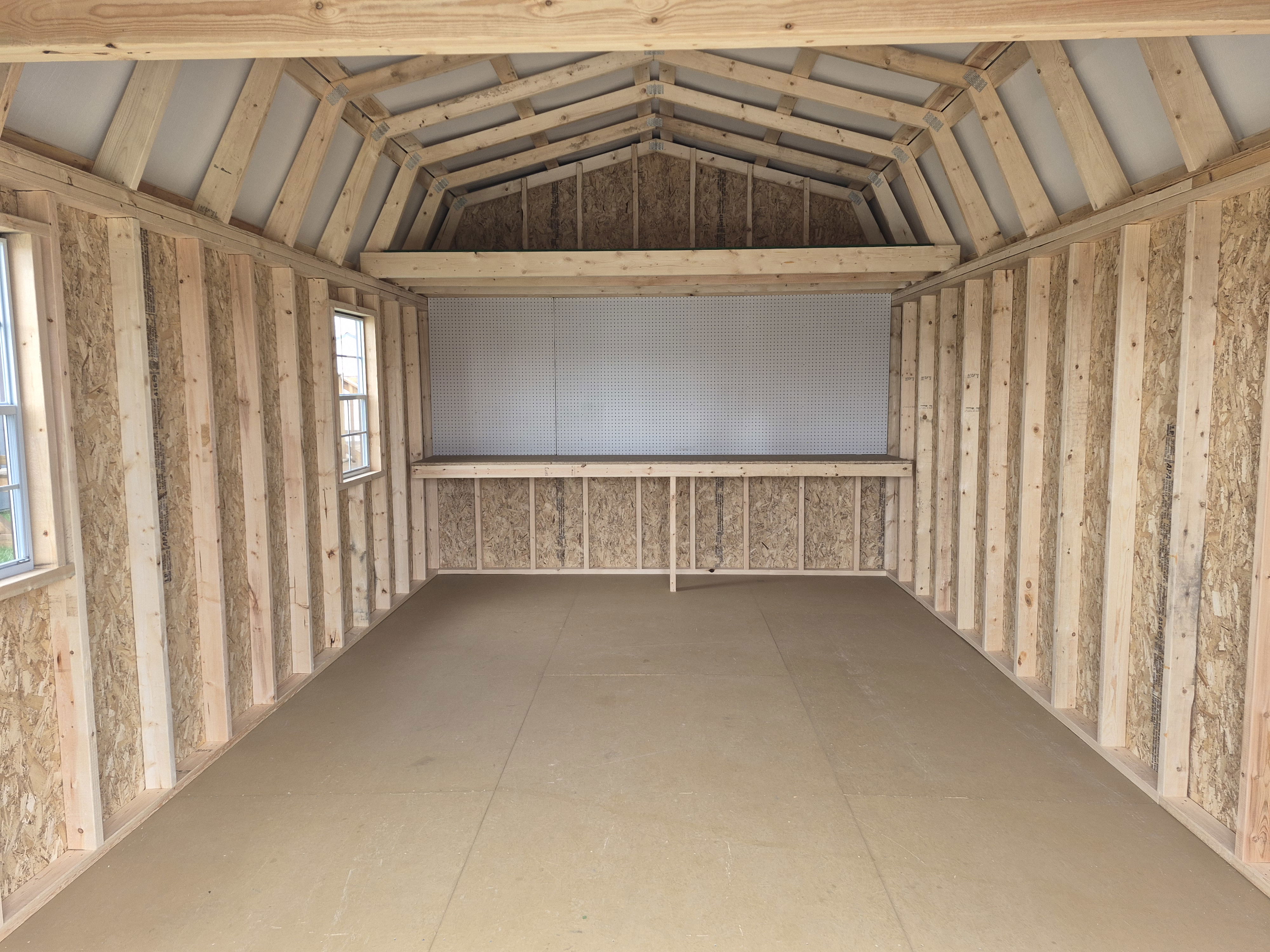 Double-door on front end. 2 windows on left-hand side. Loft on each end. Workbench with pegboard underneath back loft. Comes with all the Classic upgrades. Black siding, with Dark grey trim, Stained doors/shutters, and black metal roof.