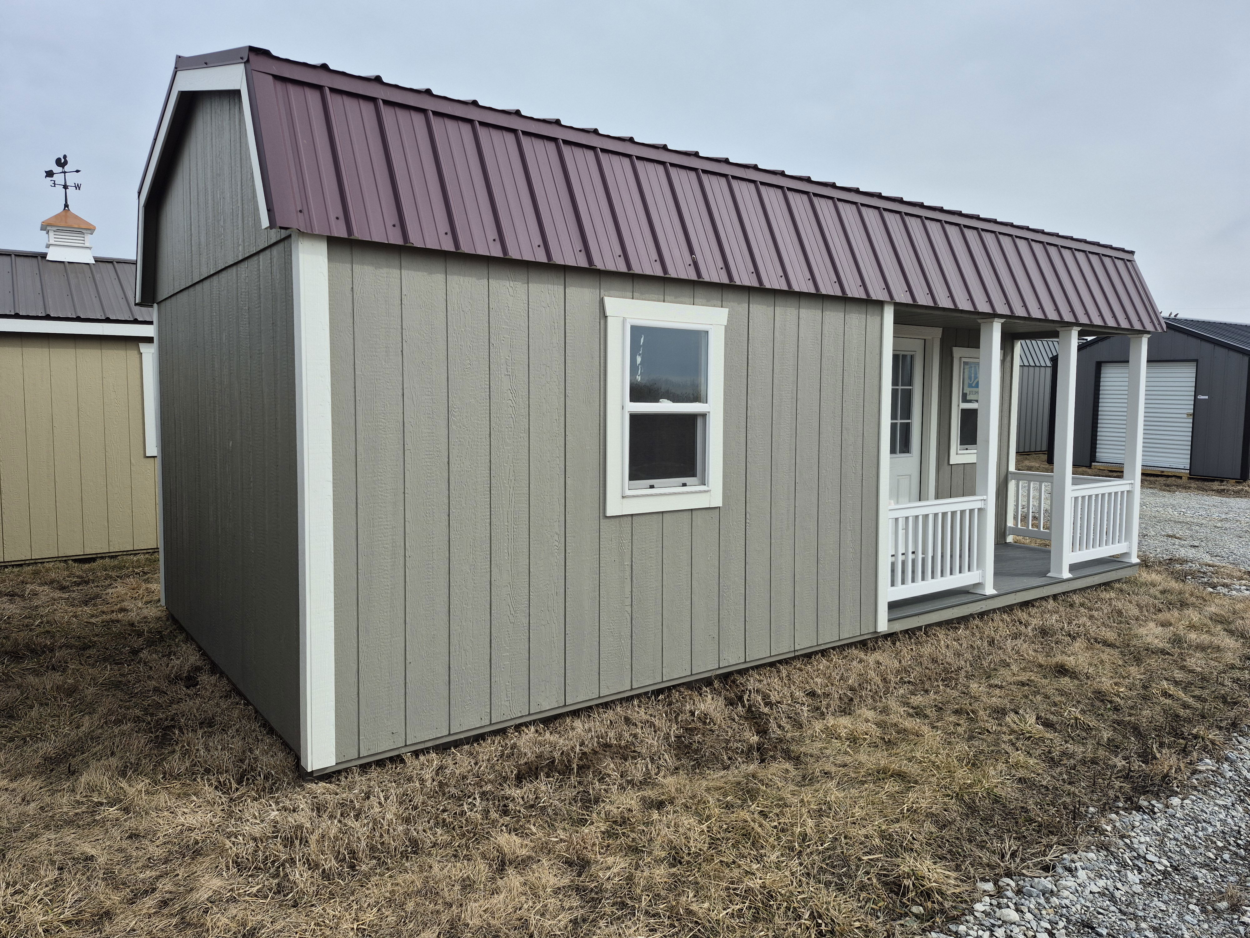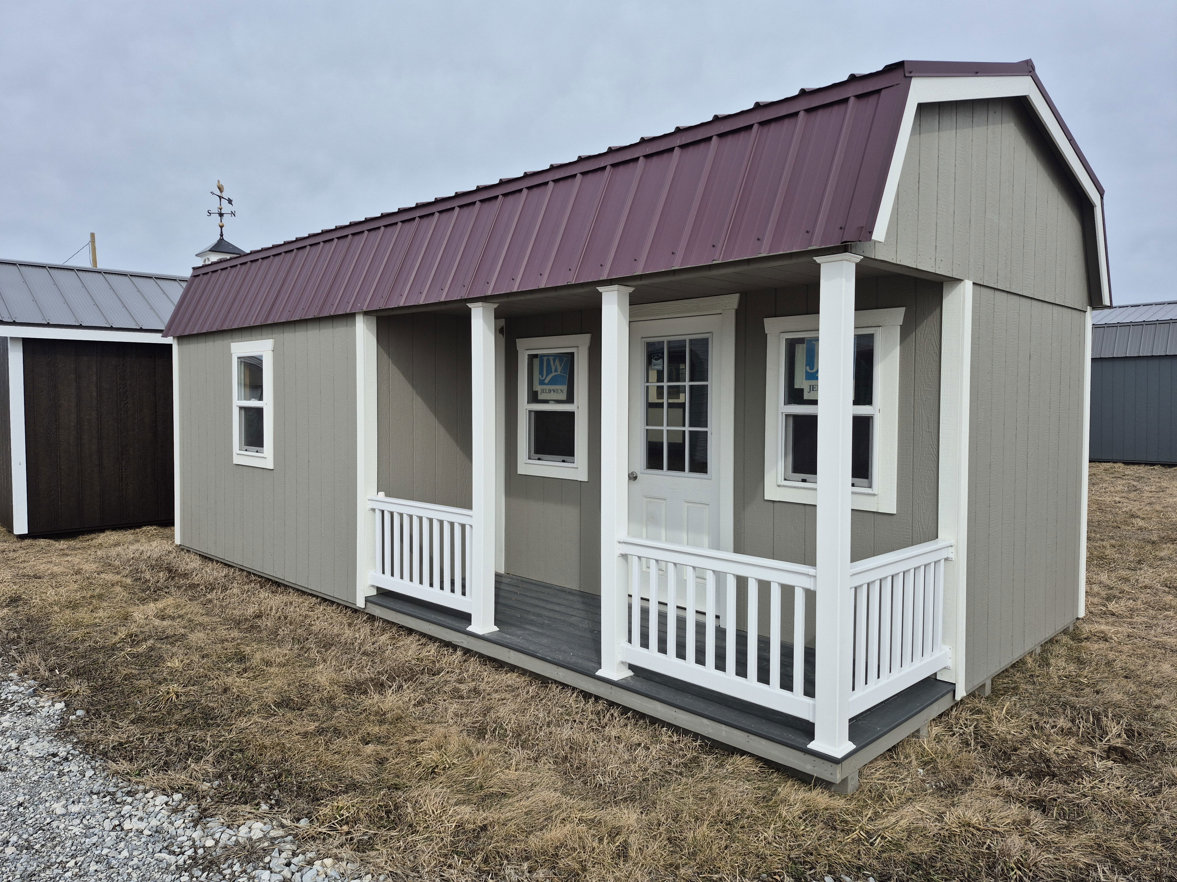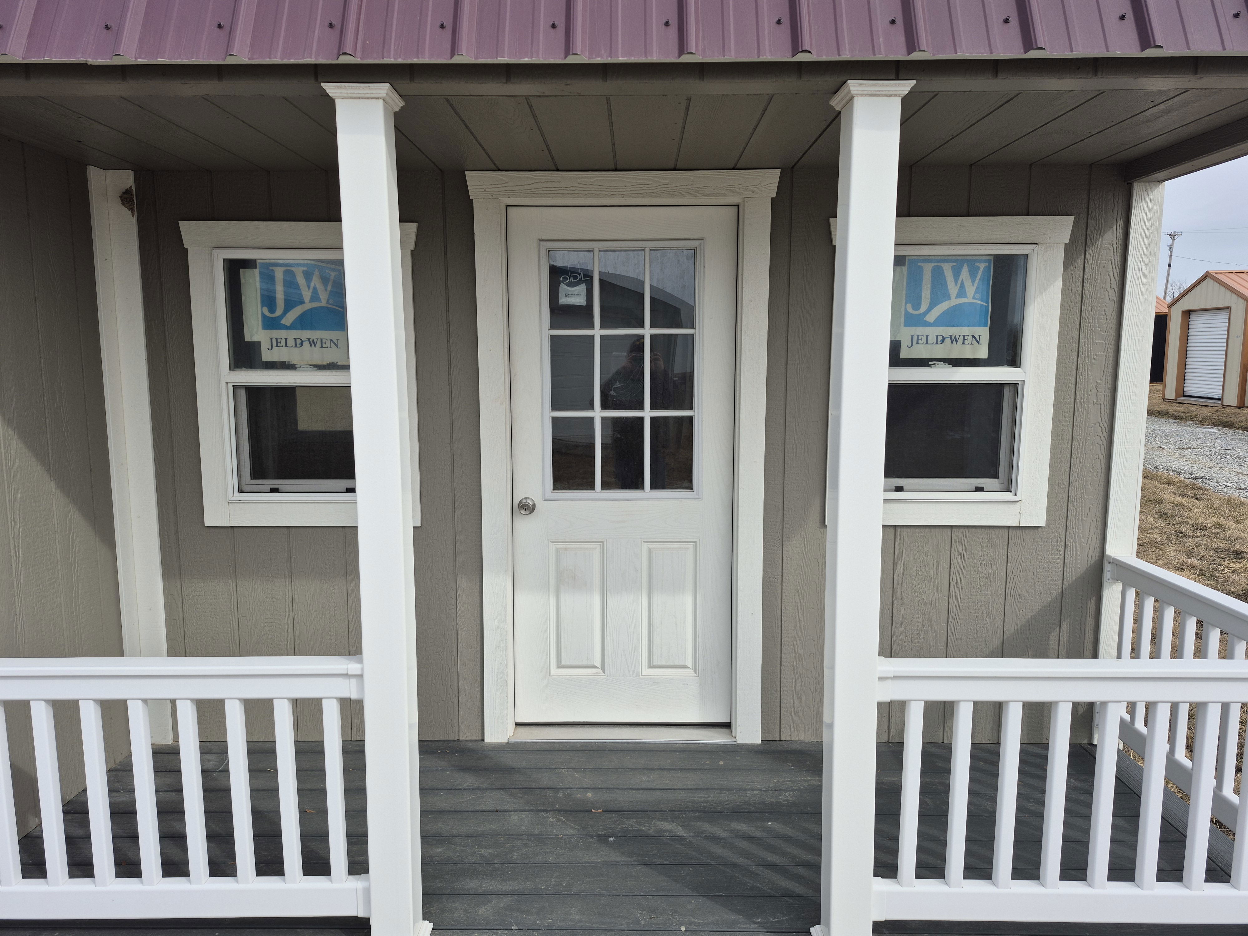 4 insulated 2x3 windows. 9-lite entry door on porch. Trex decking and Vinyl wrapping on the porch. Huge loft above porch section with another 4' deep loft on the other end. 50 miles FREE delivery and set-up. Rent to Own options available.