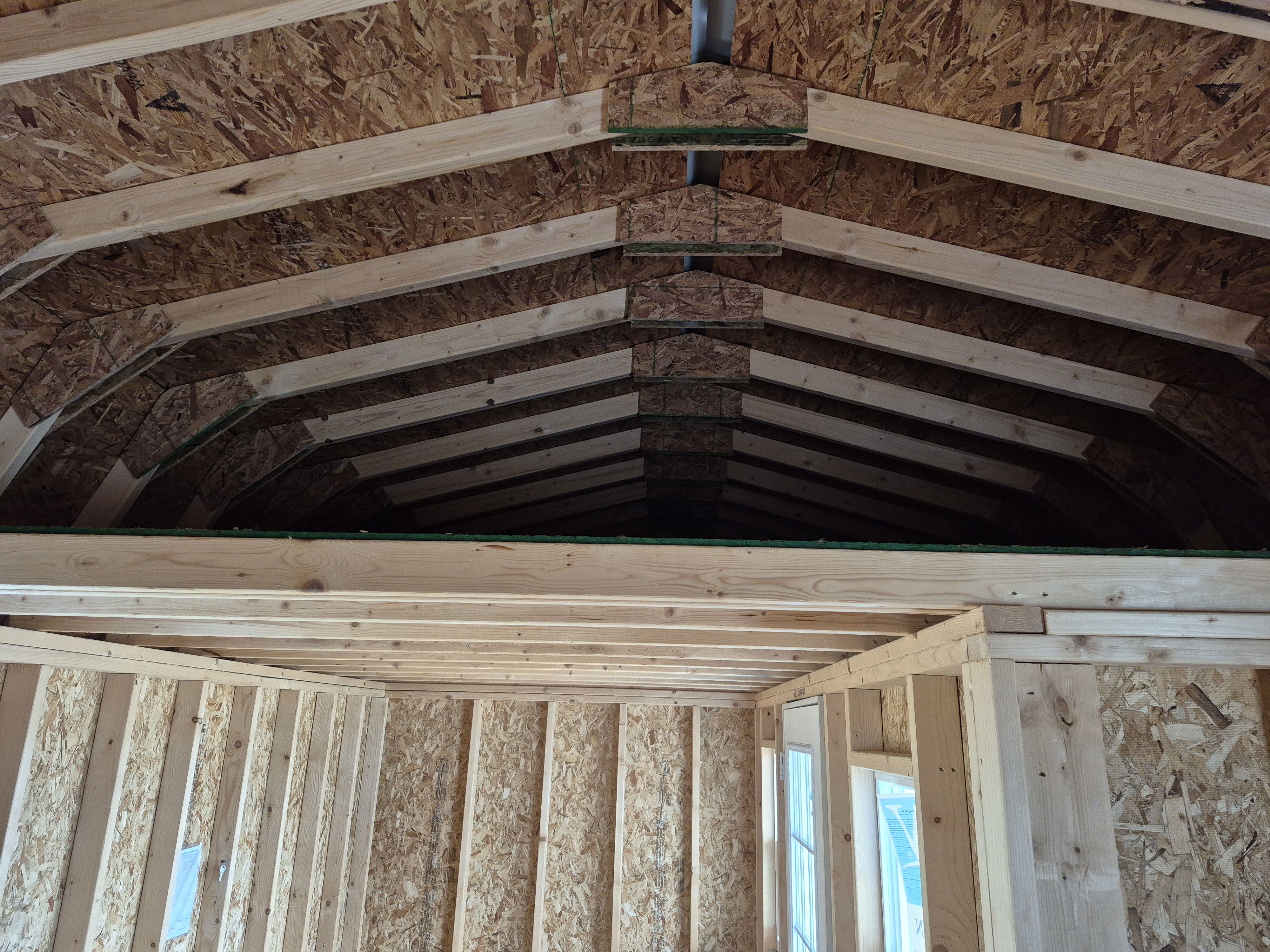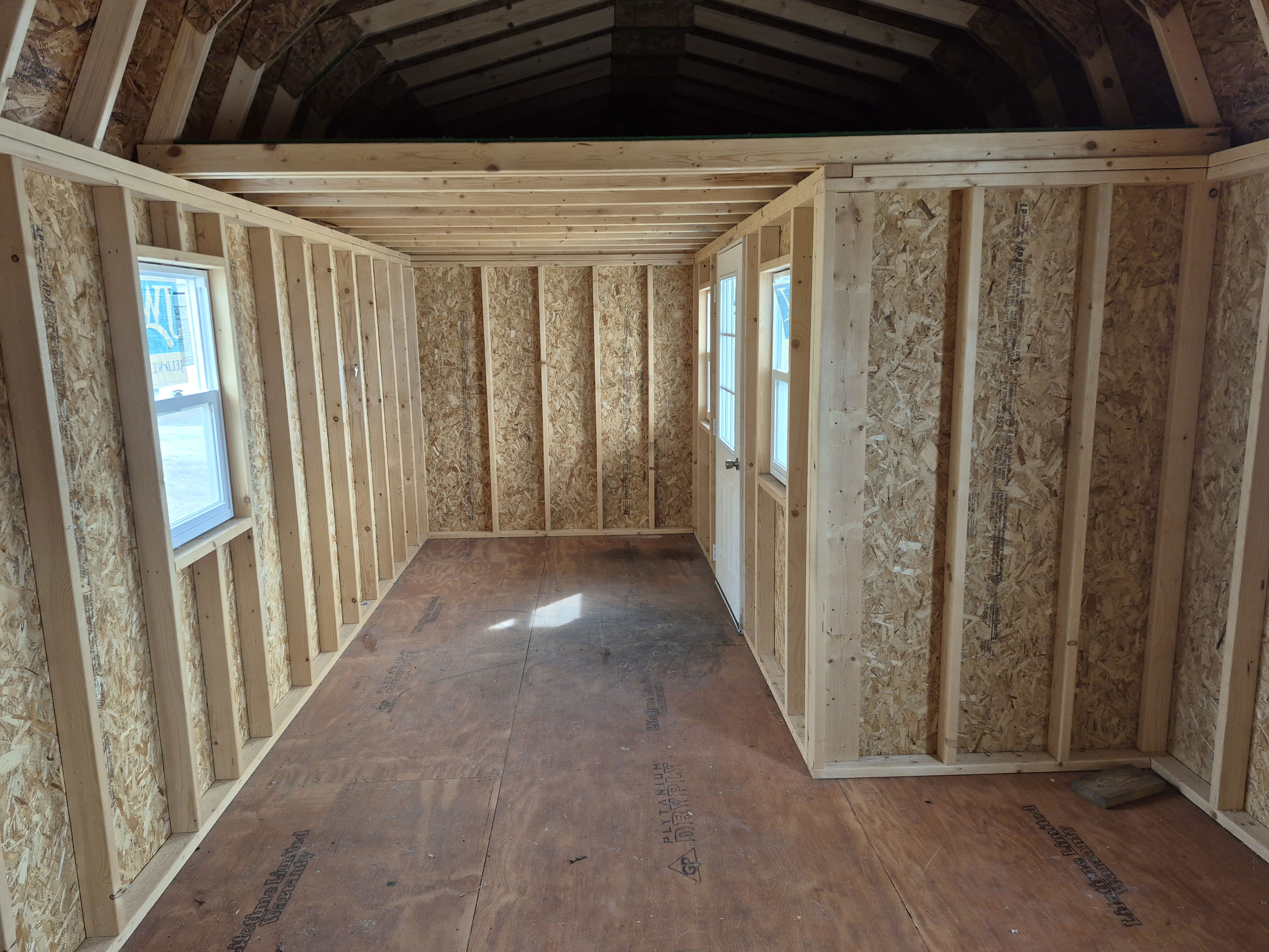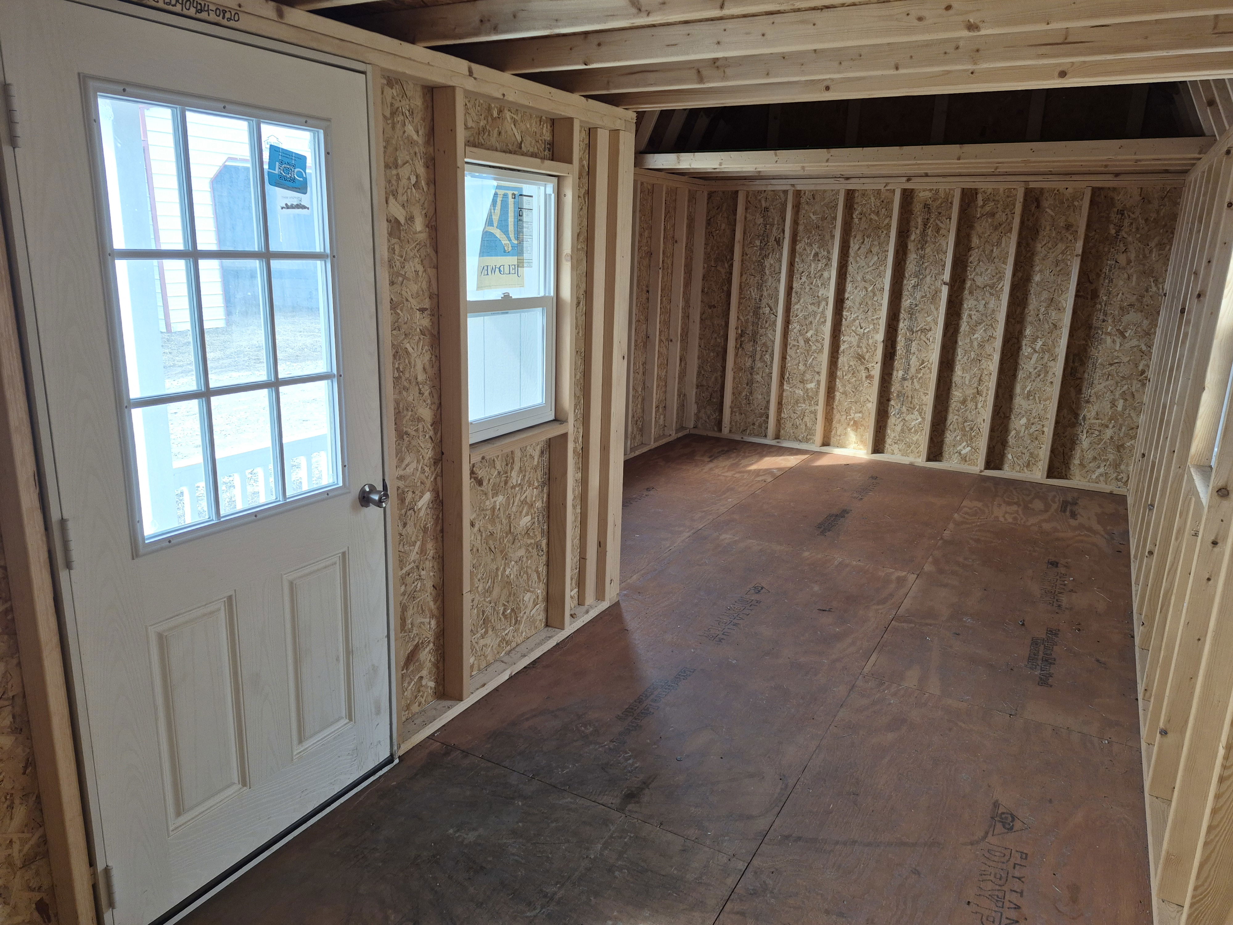 4 insulated 2x3 windows. 9-lite entry door on porch. Trex decking and Vinyl wrapping on the porch. Huge loft above porch section with another 4' deep loft on the other end. 50 miles FREE delivery and set-up. Rent to Own options available.