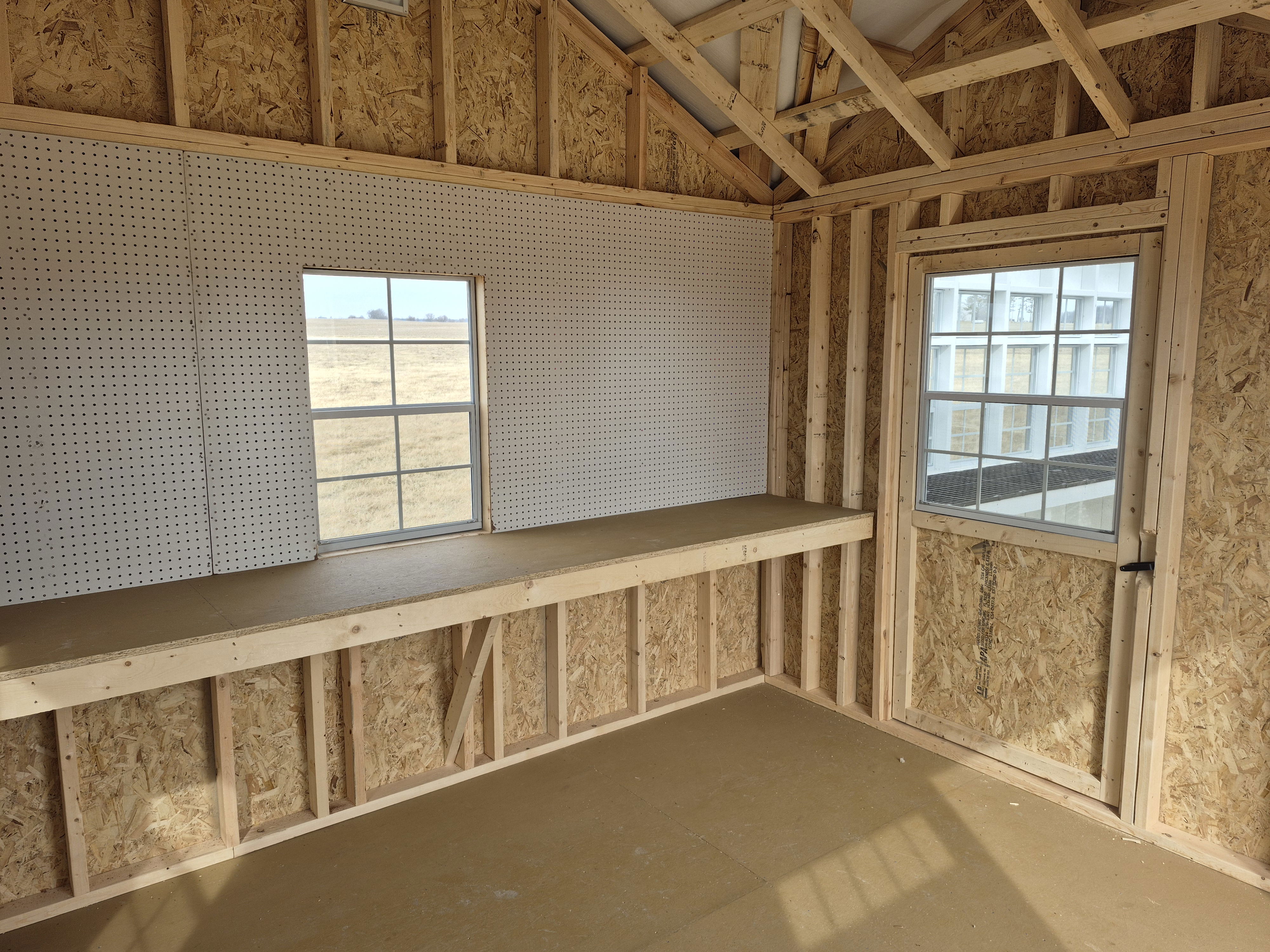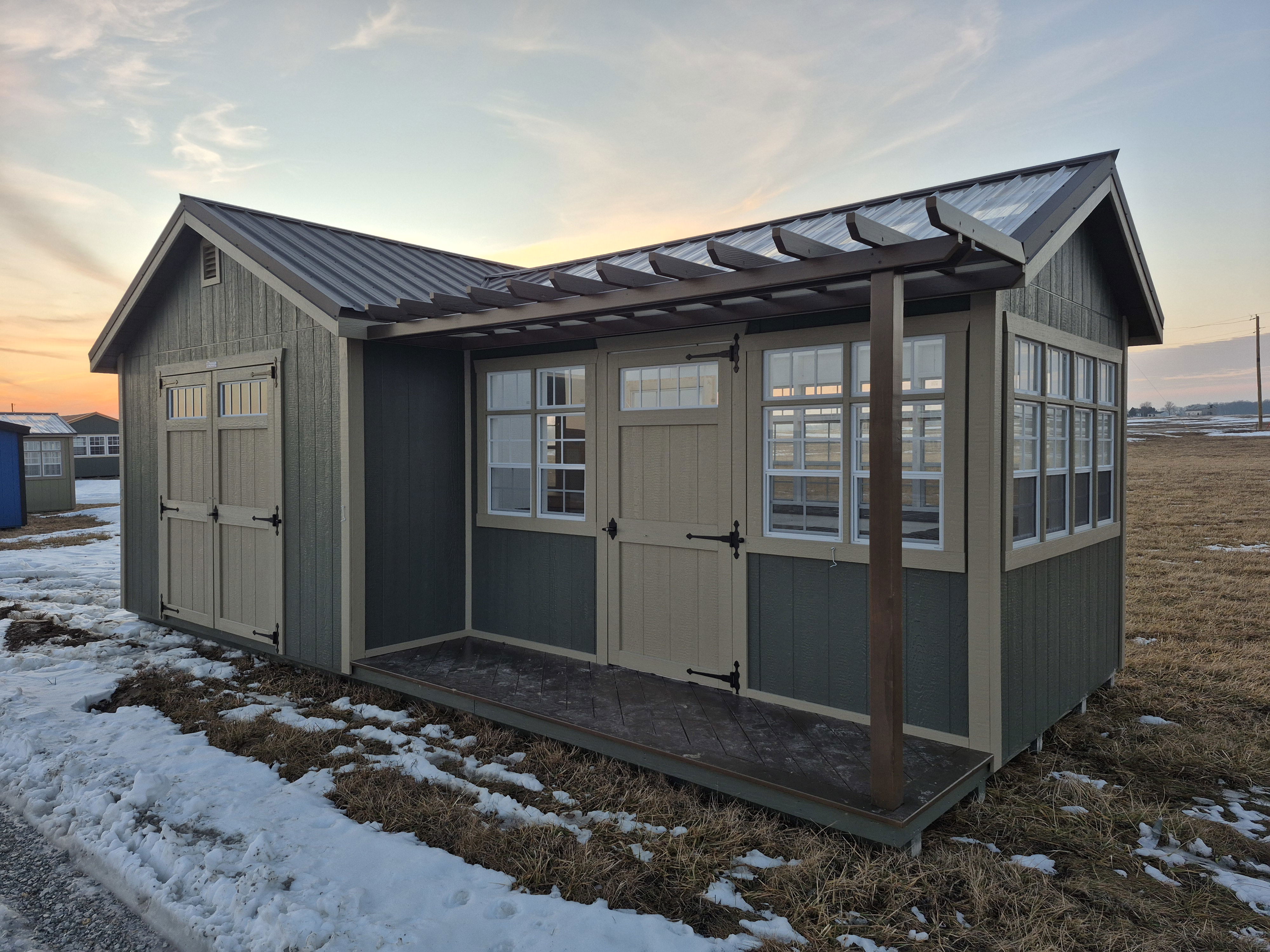 Greenhouse/Shed Combo with perpendicular roofline. Porch with mini-pergola on greenhouse entrance. Both halves connected with partition wall. Shelving for plants on greenhouse side. Workbench and Pegboard in storage side. 50 miles FREE delivery and set-up. Rent to Own options available.