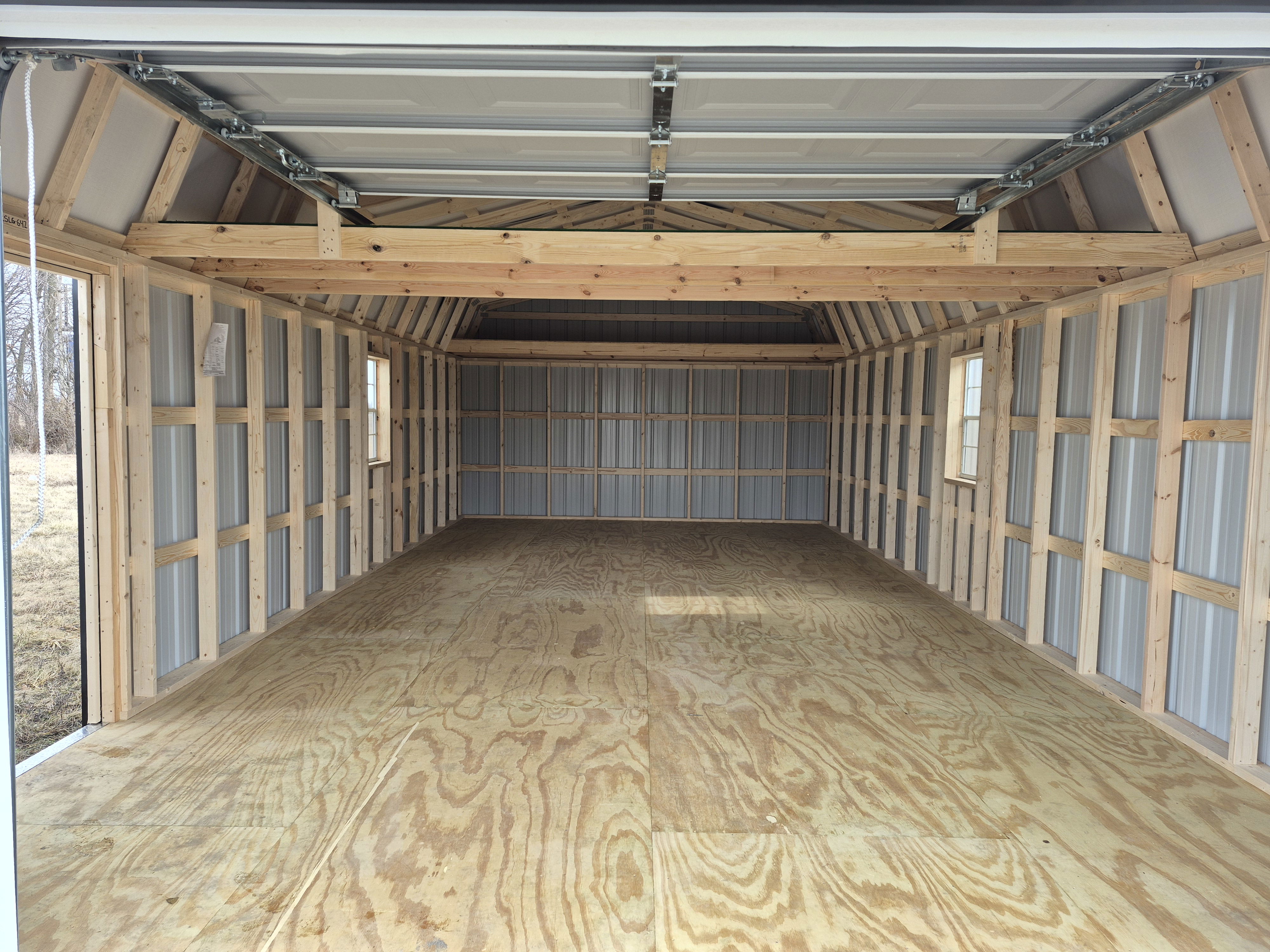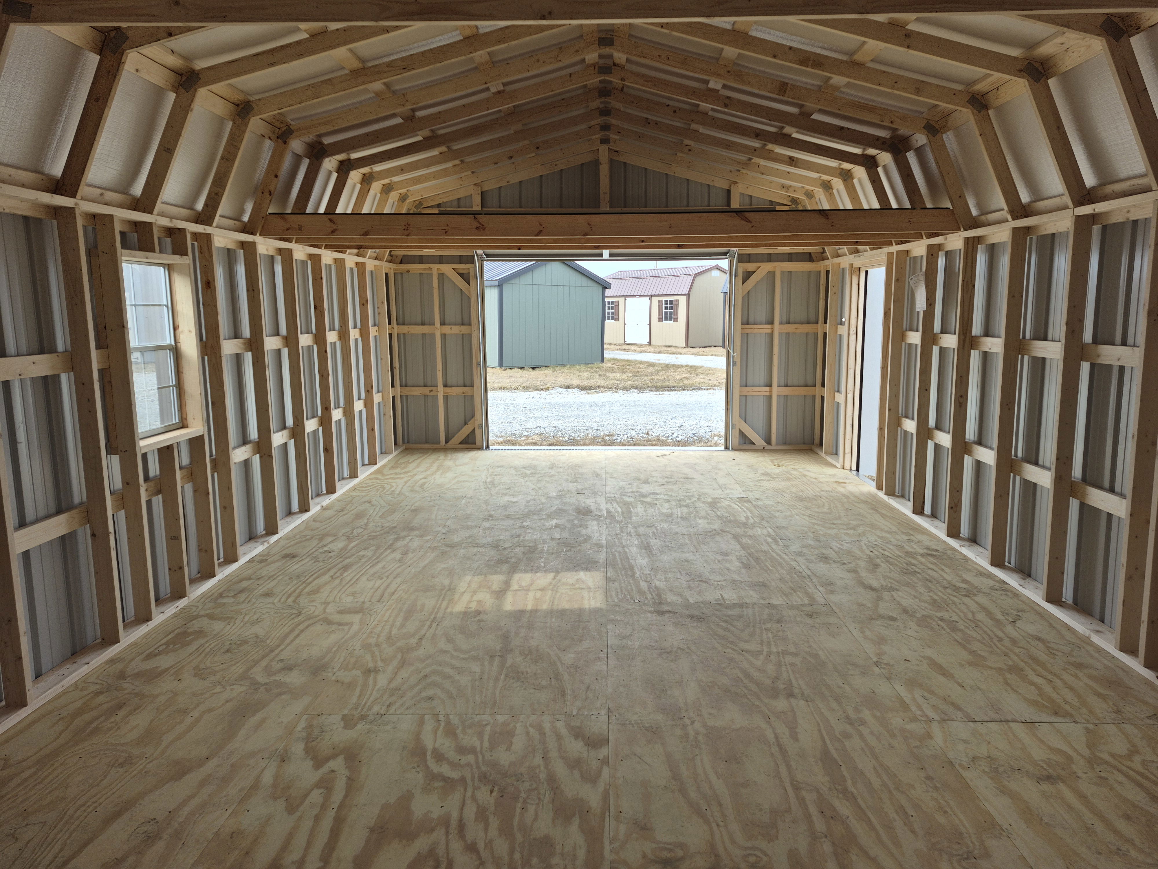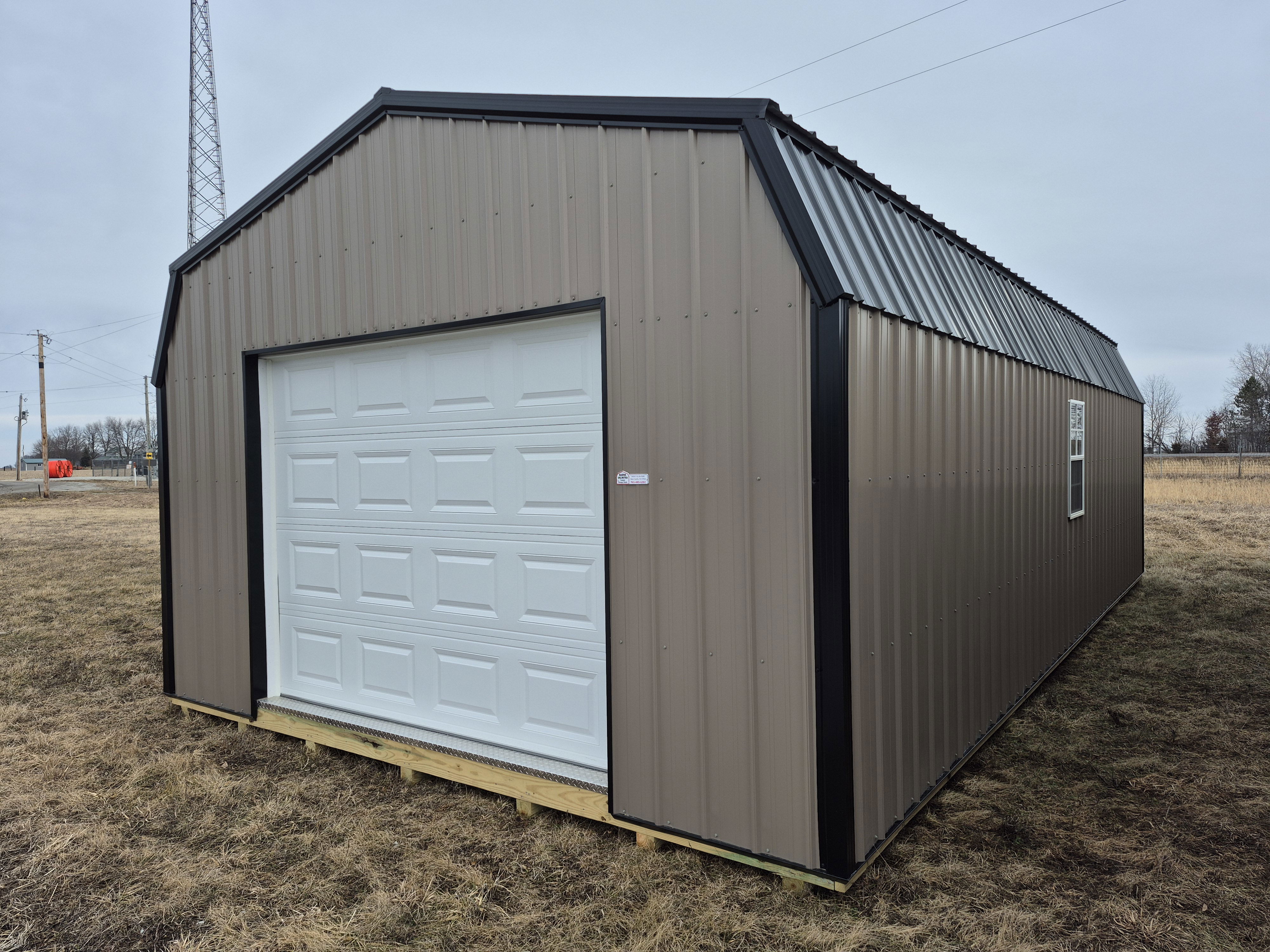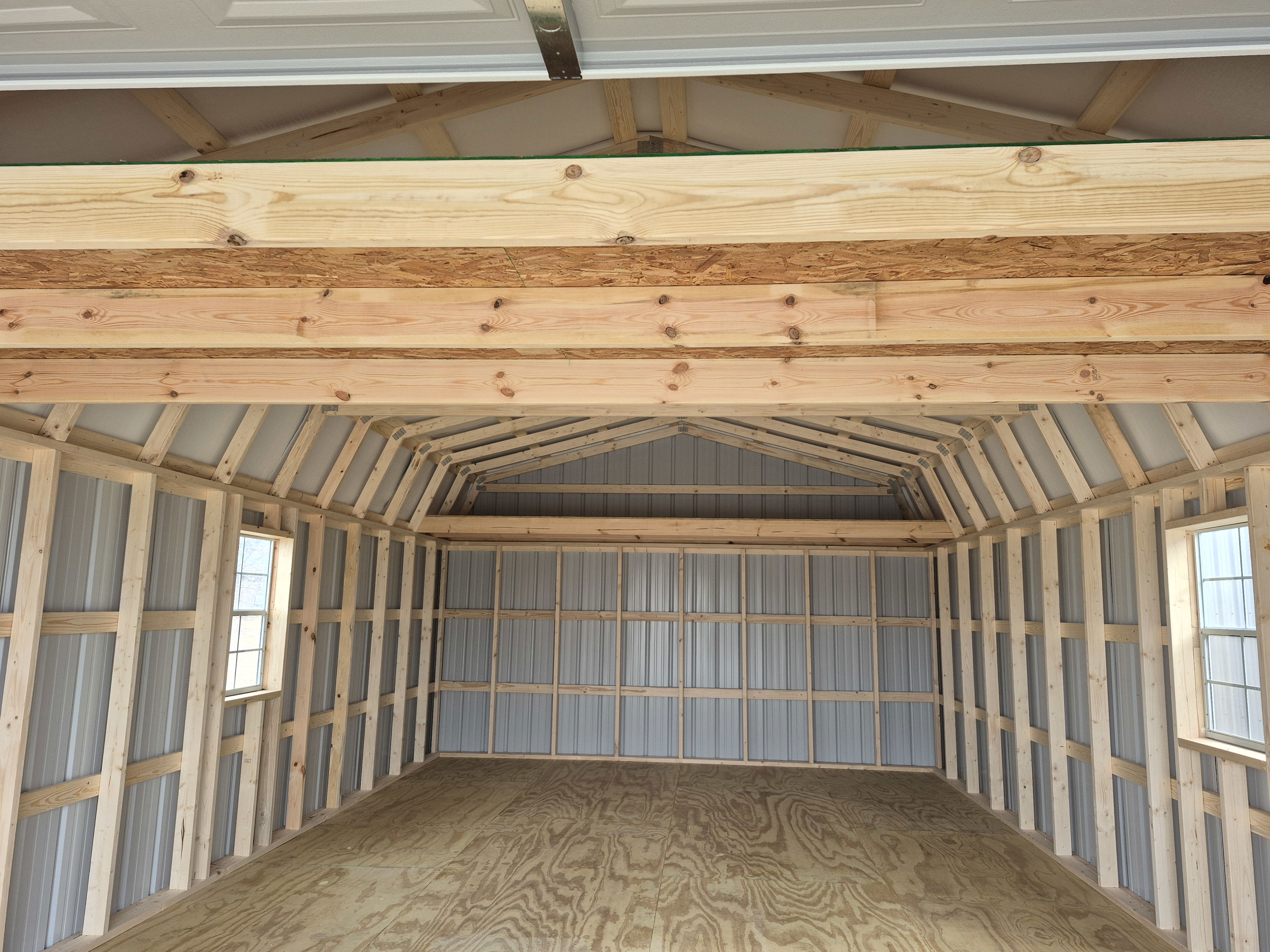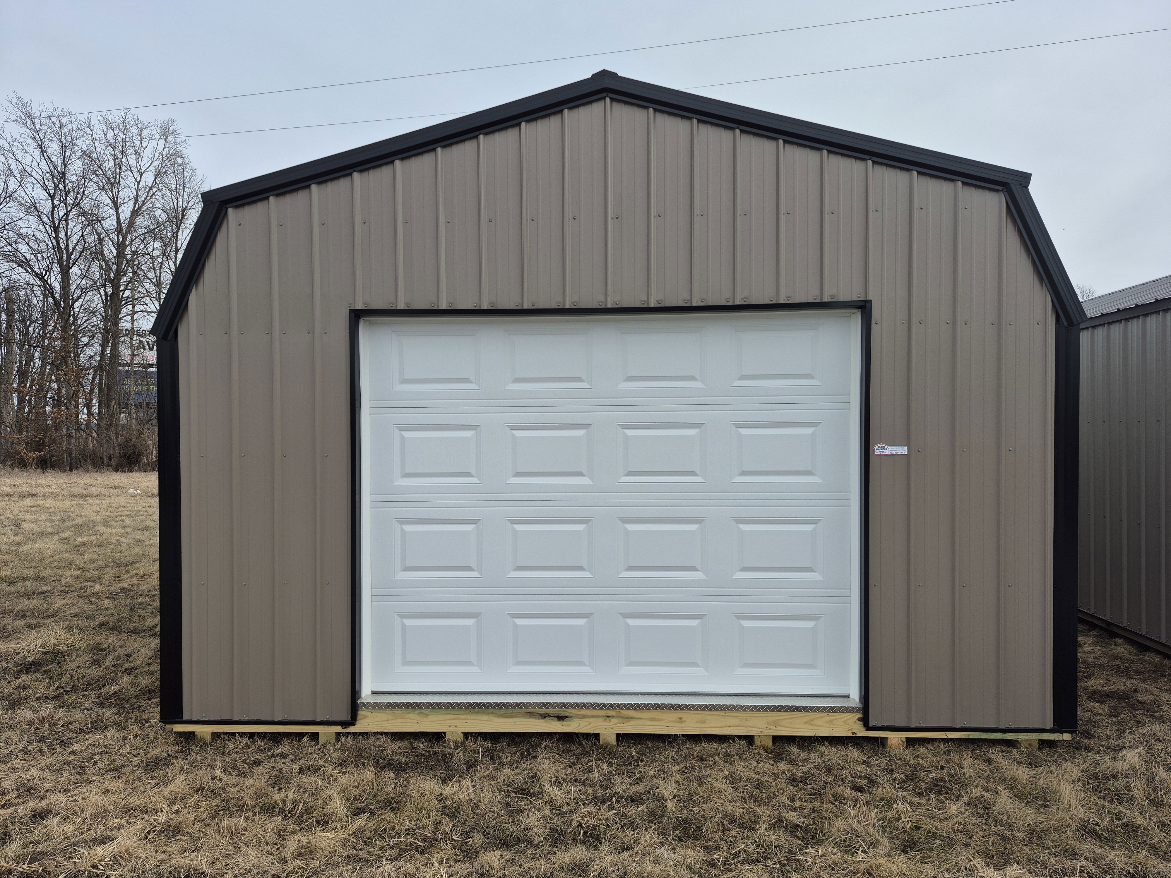 9x7 Overhead door on end with entry door on left side. One window on either broad side. 2 Lofts up top. Reinforced floors to hold vehicles. 50 miles FREE delivery and set-up. Rent to Own options available.